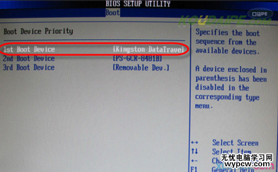 啟動優先級設備選擇(Boot Device Priority)在第一啟動設備(1st Boot Device)里選擇U盤。如果沒有發現您的U盤,按鍵盤上的回車鍵進入下一步。如圖二