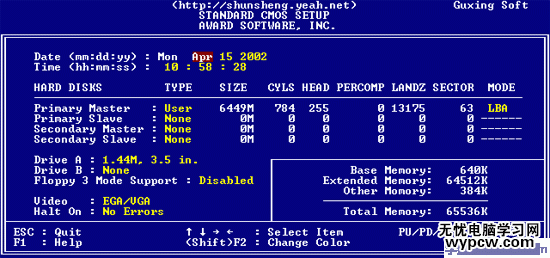 下面是硬盤情況設置,列表中存在PRIMARY MASTER 第一組IDE主設備;PRIMARY SLAVE 第一組IDE從設備;SECONDARY MASTER 第二組IDE主設備;SECONDARY SLAVE 第二組IDE從設備。這里的IDE設備包括了IDE硬盤和IDE光驅,第一、第二組設備是指主板上的第一、第二根IDE數(shù)據(jù)線,一般來說靠近芯片的是第一組IDE設備,而主設備、從設備是指在一條IDE數(shù)據(jù)線上接的兩個設備,大家知道每根數(shù)據(jù)線上可以接兩個不同的設備,主、從設備可以通過硬盤或者光驅的后部跳線來調整。