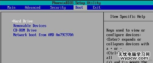 5、按鍵盤的光標的“→”,轉到Boot選項卡。這里設置虛擬機系統的啟動盤順序,把硬盤設置為第一項。方法:按鍵盤的“+”和“-”進行順序的調整。