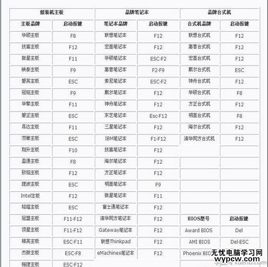(2)U盤啟動可以讓我們在不使用其他磁盤介質的情況下,讓U盤進行臨時啟動,不同品牌的電腦主板BIOS啟動的快捷方法也不同,幾種不同品牌常用啟動熱鍵如下圖所示;