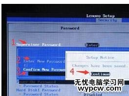 3. 要設置bios超級管理員密碼,請選擇首行suppervisor password,回車進入,分別在enter new password和confirm new password兩行輸入相同的字符作為密碼(每行密碼錄入完成,以回車鍵結束錄入),彈出setup confirmation窗口界面。
