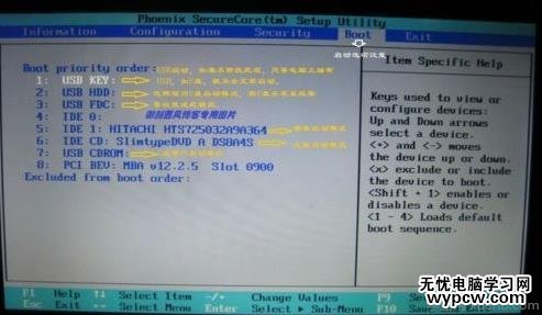 下圖是啟動項設置。系統默認的設置是USB KEY,這就是為什么在插上U盤等移動介質時,計算機無法啟動的原因所在。我們常用的啟動項只有幾種,一是硬盤啟,二是光驅啟動, 三是U盤量產啟動(USB CDROM),四是U盤軟啟動(USB HDD)。其它類型在實際應用中較少。因此我們需要對這些啟動項需要調整。