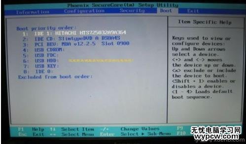 下圖是重新設置的啟動項,今天又作了調整,把第三項調整到后面了,把USB HDD調整到了前面。其實,我們只需把硬盤啟動調整到第一項就行了。在安裝系統時,只需要開機按F12,就可以進行首先啟動項設置。