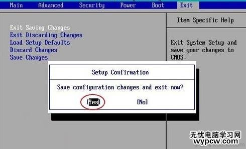 3最后將光標定位到“Exit”選項卡,并選擇第一項“Exit Save Changes”,然后按回車鍵,并在彈出的窗口中選擇“YES”,再次按回車確定,接著電腦重啟并從光驅啟動。