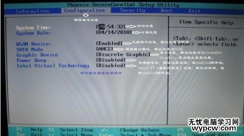2、下圖是硬件組態設置。主要包括:時間、日期設置,無線網卡、硬盤接口模式、顯卡、電耗提示音、因特爾虛擬化技術等設置。相關詳細設置如下圖(圖中把AHCI寫成ACHI了,特此更正):