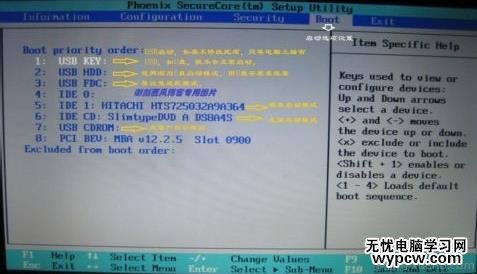 4、下圖是啟動項設置。系統默認的設置是USB KEY,這就是為什么在插上U盤等移動介質時,計算機無法啟動的原因所在。我們常用的啟動項只有幾種,一是硬盤啟,二是光驅啟動, 三是U盤量產啟動(USB CDROM),四是U盤軟啟動(USB HDD)。其它類型在實際應用中較少。因此我們需要對這些啟動項需要調整。