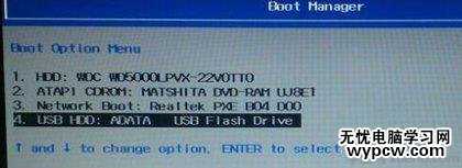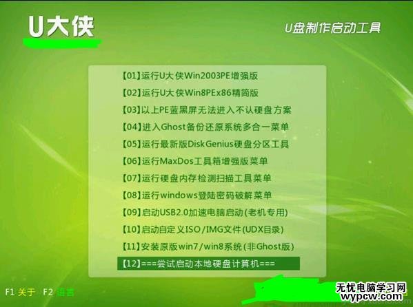 3、在啟動選擇窗口下,將光標移至“USB HDD”的選項后按回車鍵確認即可進入U大俠的主菜單界面。