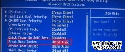 第三步、光標定位到在“First Boot Device”處,然后按回車鍵:
