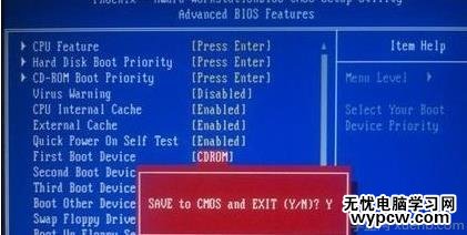 第五步、設置完成之后,按鍵盤上的F10鍵,彈出保存退出菜單,輸入Y后回車,即可重啟電腦,并從光驅啟動電腦: