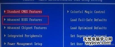 第二步、使用上下左右四個光標鍵,調整光標到“Advanced BIOS Features”處,然后按回車鍵: