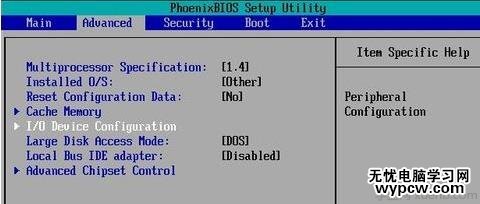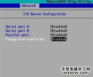 3、按鍵盤的光標的“→”,轉到Advanced選項卡,選擇I/O Device Configuration
