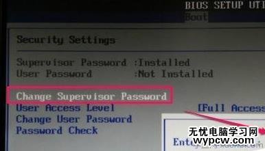 1、取消我們設置的BIOS開機密碼也是比較簡單的,當然前提是你記得住自己設置的BIOS開機密碼,我們還是開機的時候進入BIOS設置,然后選擇BOOT菜單中的Security【安全】,然后這里在Change Supervisor Password上面直接回車。