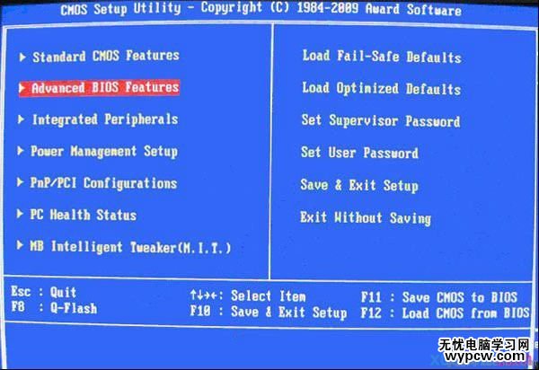 上圖1:開機(jī)按Del鍵進(jìn)入該BIOS設(shè)置界面,選擇高級BIOS設(shè)置Advanced BIOS Features