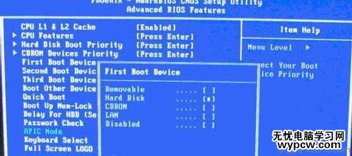 4再選擇第一啟動設備(First Boot Device):該版本的BIOS這里沒有U盤的“USB-HDD”、“USB-ZIP”之類的選項,經嘗試選擇移動設備“Removable”不能啟動,但選擇“Hard Disk”可以啟動電腦。