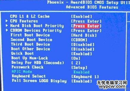 高級BIOS設置(Advanced BIOS Features)界面,首先選擇硬盤啟動優先級:Hard Disk Boot Priority,如圖: