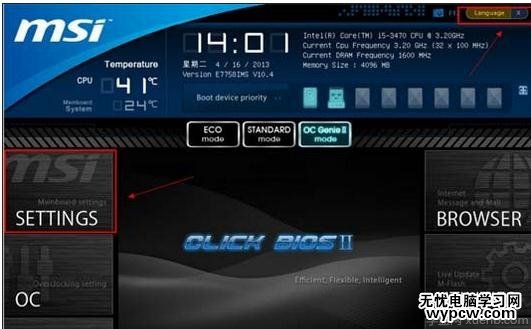 3、然后會看到BIOS設置界面,在右上角“language”處切換成中文,然后用“TAB”鍵或鼠標將光標移動到“SETTINGS”處(光標移到“SETTINGS”項時會亮起)。如下圖