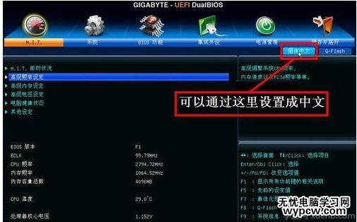 4,由于UEFI是一種新BIOS,可以支持中文語(yǔ)言,這樣就大大方便對(duì)英文不太了解的人進(jìn)行設(shè)置BIOS,在主界面右上角的位置有一個(gè)按鈕,英文為“Language”,點(diǎn)擊它,打開一個(gè)窗口,選擇里面的“簡(jiǎn)體中文”,主界面就變成中文的了。