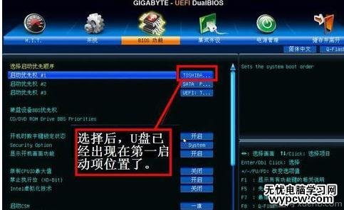 7,當(dāng)按了Enter確定鍵之后,退出小窗口,U盤就已經(jīng)被選定成為了第一優(yōu)先啟動(dòng)的項(xiàng)。如圖: