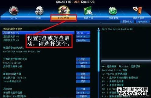 5,然后用左右方向鍵,移到"BIOS功能"這一項(xiàng)來(lái), 我們要在這個(gè)選項(xiàng)下面進(jìn)行U盤或光盤的啟動(dòng)設(shè)置。