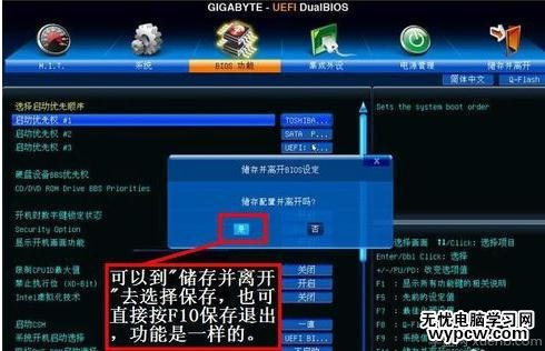 8,最后的工作就是要保存設(shè)置了,你可以到主界面的“儲(chǔ)存并離開”的選項(xiàng)下面去設(shè)置保存,還有一個(gè)更直接的方法是,直接按F10,就可以快捷地進(jìn)行保存并退出,這兩項(xiàng)功能都是一樣的,在彈出的窗口中按“是”,這樣,UEFI設(shè)置從U盤或光盤的啟動(dòng)方法就完成了。