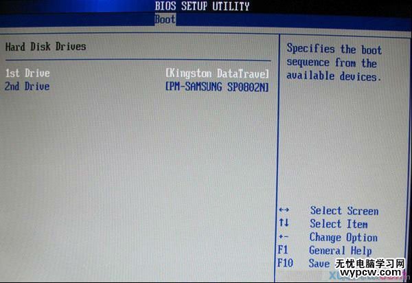 上圖3-2 硬盤驅(qū)動(dòng)器“Hard Disk Drives”選擇:選擇U盤為第一啟動(dòng)設(shè)備“1st Drive”。如果先在“Hard Disk Drives”里面選擇U盤為第一啟動(dòng)設(shè)備,如圖3-2所示,那么這里就會(huì)顯示有U盤,那就選擇U盤為第一啟動(dòng)設(shè)備,如圖4-2所示。