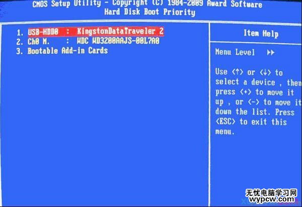 上圖3-1:硬盤啟動(dòng)優(yōu)先級(jí)(Hard Disk Boot Priority)選擇:使用小鍵盤上的加減號(hào)“+、-”來(lái)選擇與移動(dòng)設(shè)備,將U盤選擇在最上面。然后,按ESC鍵退出,回到圖2-1的設(shè)置界面。