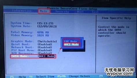 用鍵盤的上下左右鍵。移動到【Main】處,再用下鍵移動到【SATA Mode:AHCI Mode】處,按回車鍵,就可以看到該主板支持兩種IDE Mode、AHCI Mode類型。