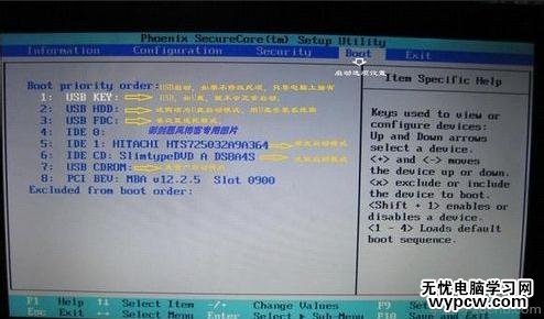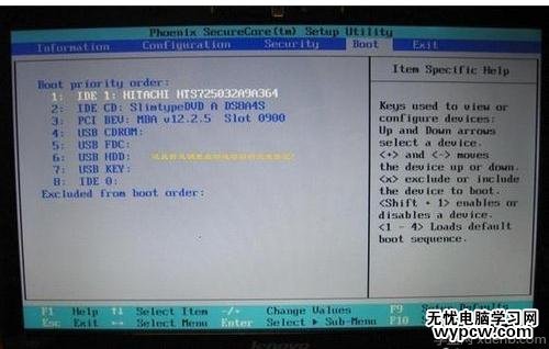 3、下圖是啟動項設置。系統默認的設置是USB KEY,這就是為什么在插上U盤等移動介質時,計算機無法啟動的原因所在。我們常用的啟動項只有幾種,一是硬盤啟,二是光驅啟動,三是U盤量產啟動,四是U盤軟啟動。我們可以對這些啟動項進行相應的調整。