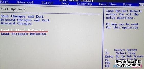 2、使用左右方向鍵將光標(biāo)移至“Exit”菜單,在菜單中通過(guò)上下方向鍵移動(dòng)光標(biāo)選擇“Load Optimal Defaults”選項(xiàng),回車執(zhí)行,如下圖所示: