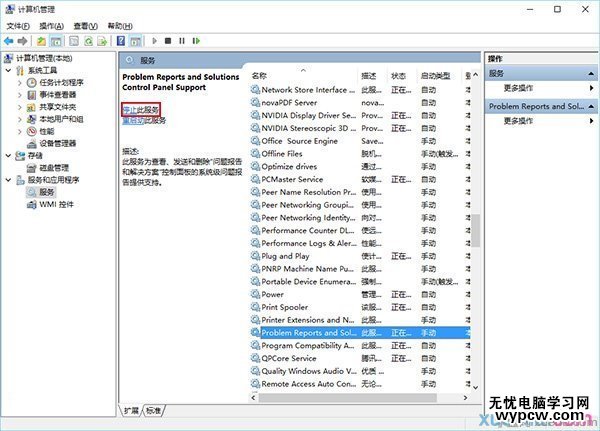 10、在中間找到 Problem Reports and Solutions Control Panel Support 服務(wù),單擊后在左側(cè)點擊“停止此服務(wù)”