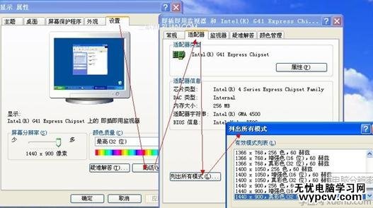 (以Intel顯卡為例)右鍵桌面空白處,選擇“屬性”—“設置”,在設置標簽的窗口右下方有一個“高級”—“適配器”—“所有模式”,選擇一種合適的模式組合即可(特別注意不要選擇太高的刷新率赫茲數)。