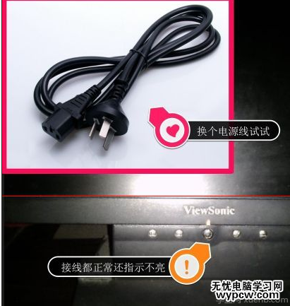 3、如果電源,插座都可以正常使用及接線都OK,可能是顯示器電源線壞了,換一條顯示器電源線試試