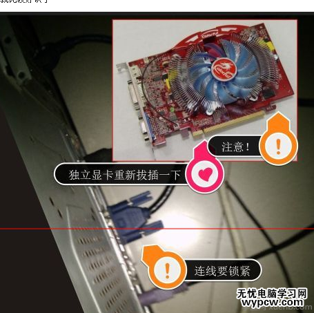 4、如果顯示器電源燈亮但不顯示,如果是獨立顯卡的主機,那把獨立顯卡重新撥插一下,如果對電腦不是很懂不知道獨立顯卡是什么樣的話!?(獨立顯卡就是連接線主機內的卡(如圖)通過連接線接顯示器