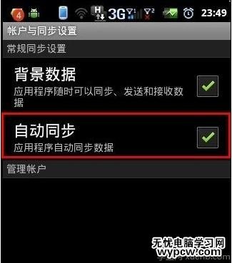 您打開時,可以看到"自動同步"是沒有打"√"的,此時勾上即可.退出界面.