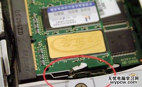 如圖所示這就是卡扣卡住內存條的樣子。要注意操作的時候一定要小心,不用用力過大,否則會損壞各種部件。安裝完成之后再蓋上后蓋兒,然后用螺絲刀擰緊螺絲就可以了。