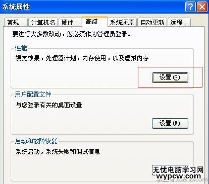 點擊系統屬性選項卡中的【高級】,之后再點擊【性能】下的【設置】