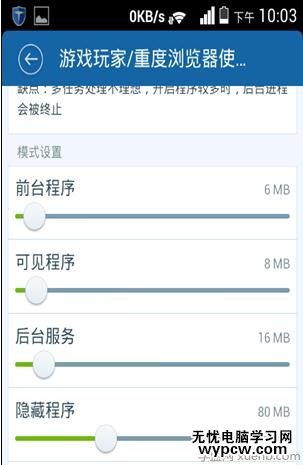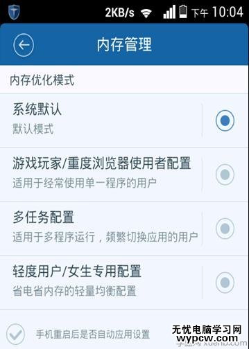 內(nèi)存管理里面包括系統(tǒng)默認,游戲重度瀏覽器使用者配置,多任務配置,輕度用戶。大家可以根據(jù)自己平時的使用習慣來選擇哪種內(nèi)存清理方案。