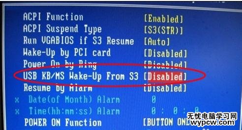 找到“S3 KB Wake-Up Function”或含義相似的選項(比如“Resume On KBC”、“Resume On ps/2 Mouse”等);
