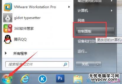 1、點擊開始圖標,選擇控制面板,如圖所示: