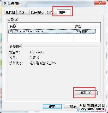 3、在鼠標屬性窗口中,點擊硬件選項,然后點擊屬性,如圖所示: