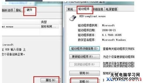 打開(kāi)設(shè)備管理器(計(jì)算機(jī)——管理——設(shè)備管理器),查看“鼠標(biāo)及其他指針設(shè)備”是否出現(xiàn)感嘆號(hào)標(biāo)志,若是就要先卸載鼠標(biāo)驅(qū)動(dòng)(控制面板——鼠標(biāo)——屬性——硬件——屬性——驅(qū)動(dòng)程序——卸載如下圖),然后重啟開(kāi)機(jī)在連上鼠標(biāo),試下是否能夠使用!