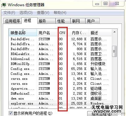 1、打開windows資源管理器,查看運行不正常的進程,如果有進程占用了很大的CPU可能就是病毒或者木馬造成的,右擊選中結束進程將這個異常進程結束: