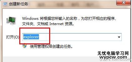 3、在彈出的新建任務窗口里輸入“explorer”,點擊確定就可以重新打開資源管理器重建緩存。