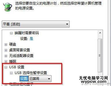 4、我們在彈出高級電源設置選項后,我們找到“USB設置”,點擊“+”號展開,“USB選擇性暫停設置”下面的狀態,都更改為“已禁用”,再保存即可。