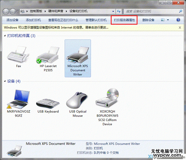 開始-設備和打印機:隨便選擇一個打印機圖標,選擇打印機服務器屬性;