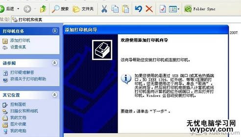 2、局域網內的其他電腦連接到打印機。請依此打開控制面板、打印機和傳真、點擊右側的添加打印機,并按下面圖示步驟完成連接。