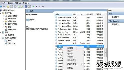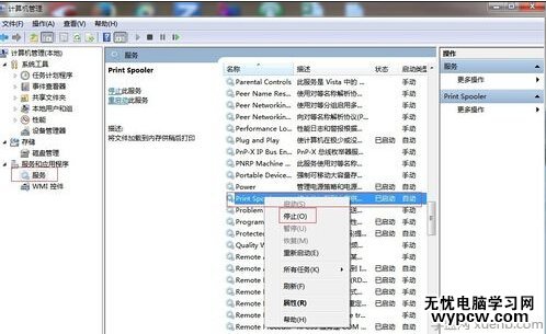 1、首先停止Print Spooler服務:點擊“我的電腦”右鍵,選擇“屬性”→“服務和應用程序”→“服務”→print spooler,點擊右鍵選擇“停止服務”