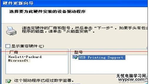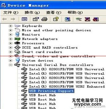 6. 選擇 USB Printing Support 點擊下一步 點擊安裝 程序安裝完畢后 , 點擊完成 , 打開通用串行總線控制器 , 此時會在該項的下面出現 USB Printing Support 端口。圖6