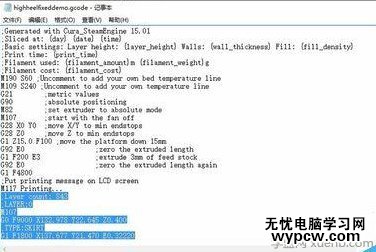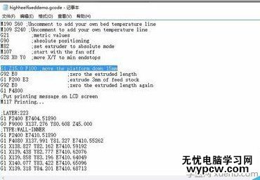 4、先另存文件,否則原來的G代碼就改了,從“layer223”以上的內容刪去,上限見圖,基本是LCD顯示狀態的語句之下,我用的cura切片軟件,其他軟件類似,注意不要刪掉啟動代碼,一會兒要改