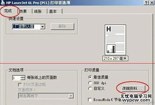 4、在彈出的“打印首選項”設置窗口中,進入“完成”選項卡,點取“詳細資料”;